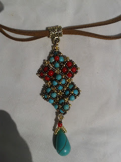 Est colgante ya está con su dueña. Ha quedado precioso y va a juego con unos pendientes que le había hecho anteriormente. Está sacado del libro Beaded Fantasies de Sabine y ella los tiene como pendientes, pero para mí quedan demasiado grandes, como colgante es un tamaño ideal.